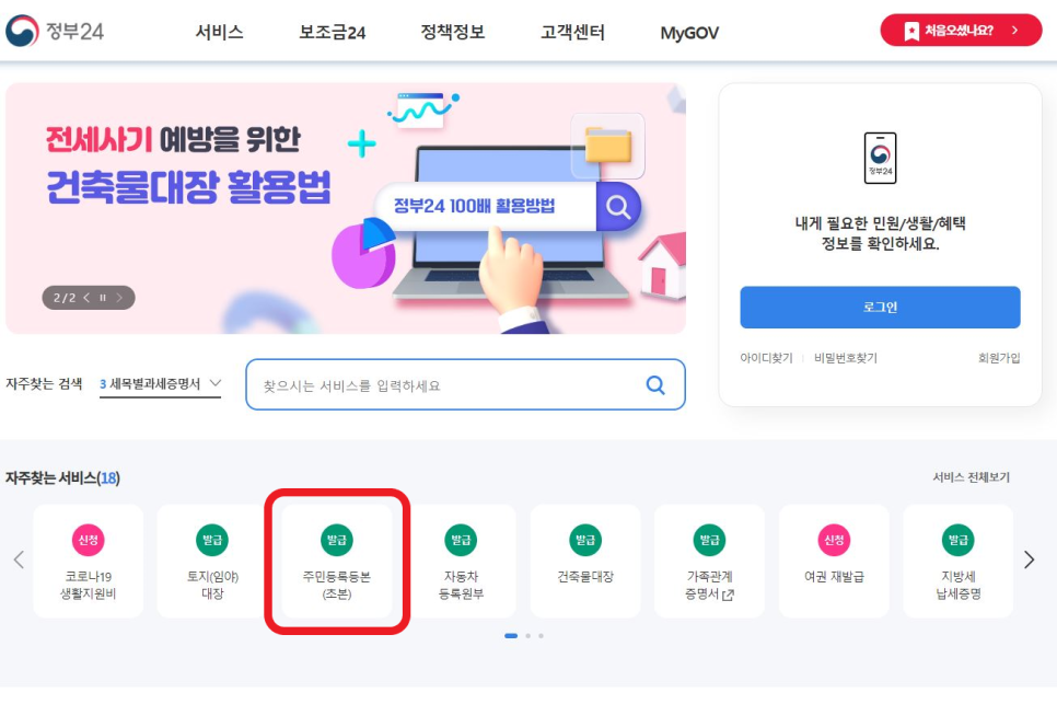 ■ 1. 정부24 홈페이지에 접속하여 원하는 서비스를 선택합니다.
